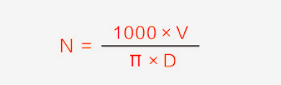 N=Rotating speed(mm-¹) V=Cutting speed(m/min) π=3.14 D=Diameter(mm) |